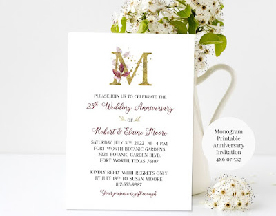 Custom Printable Rich Merlot and Gold Floral Monogram Anniversary Invitation
